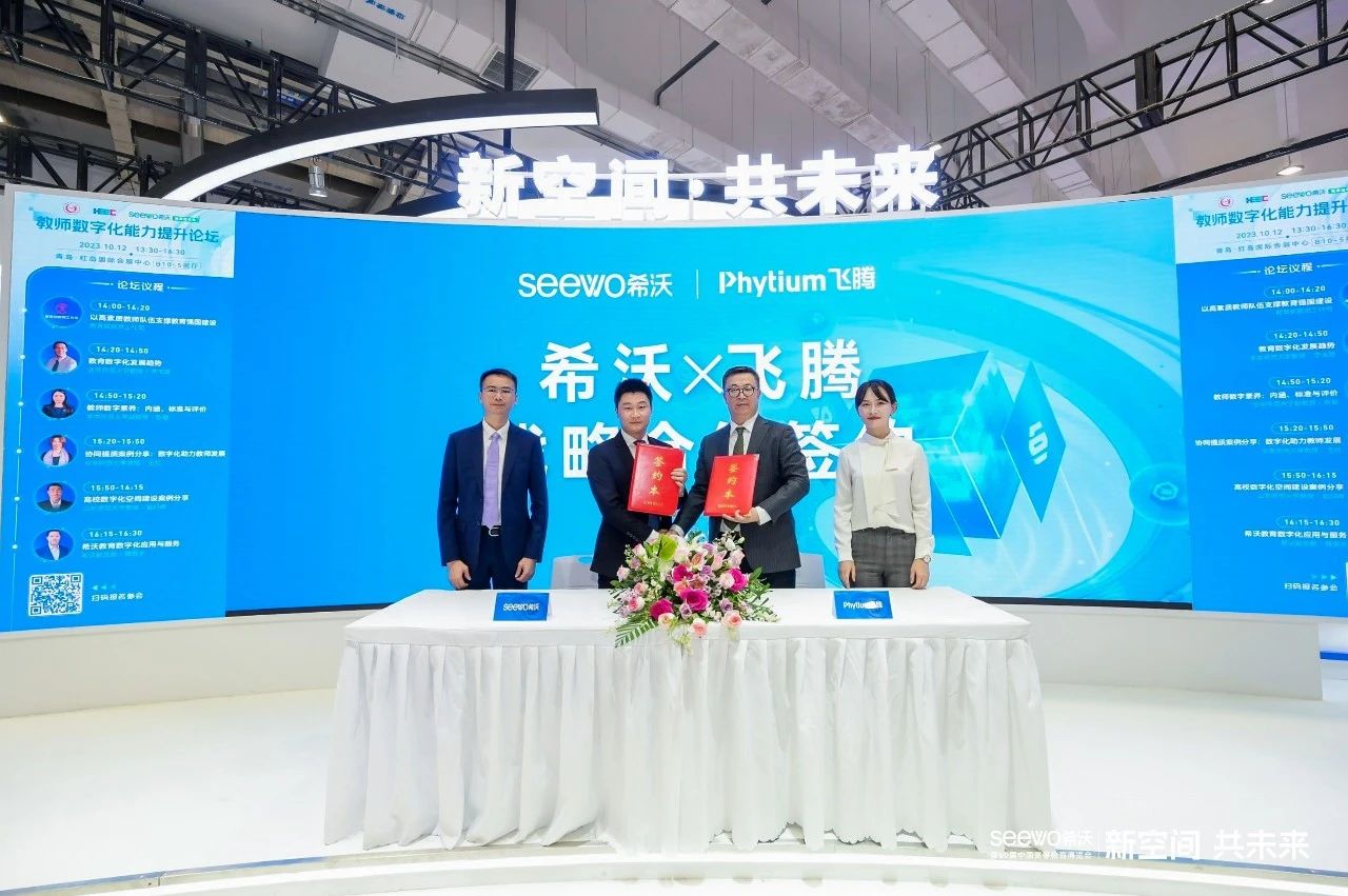 10月12日,第 60 届中国高等教育博览会在青岛开幕。当天,飞腾与教育数字化应用及服务提供商希沃签署战略合作协议,飞腾公司副总裁王瑞彬、希沃常务副总裁张凌等人出席签约仪式。