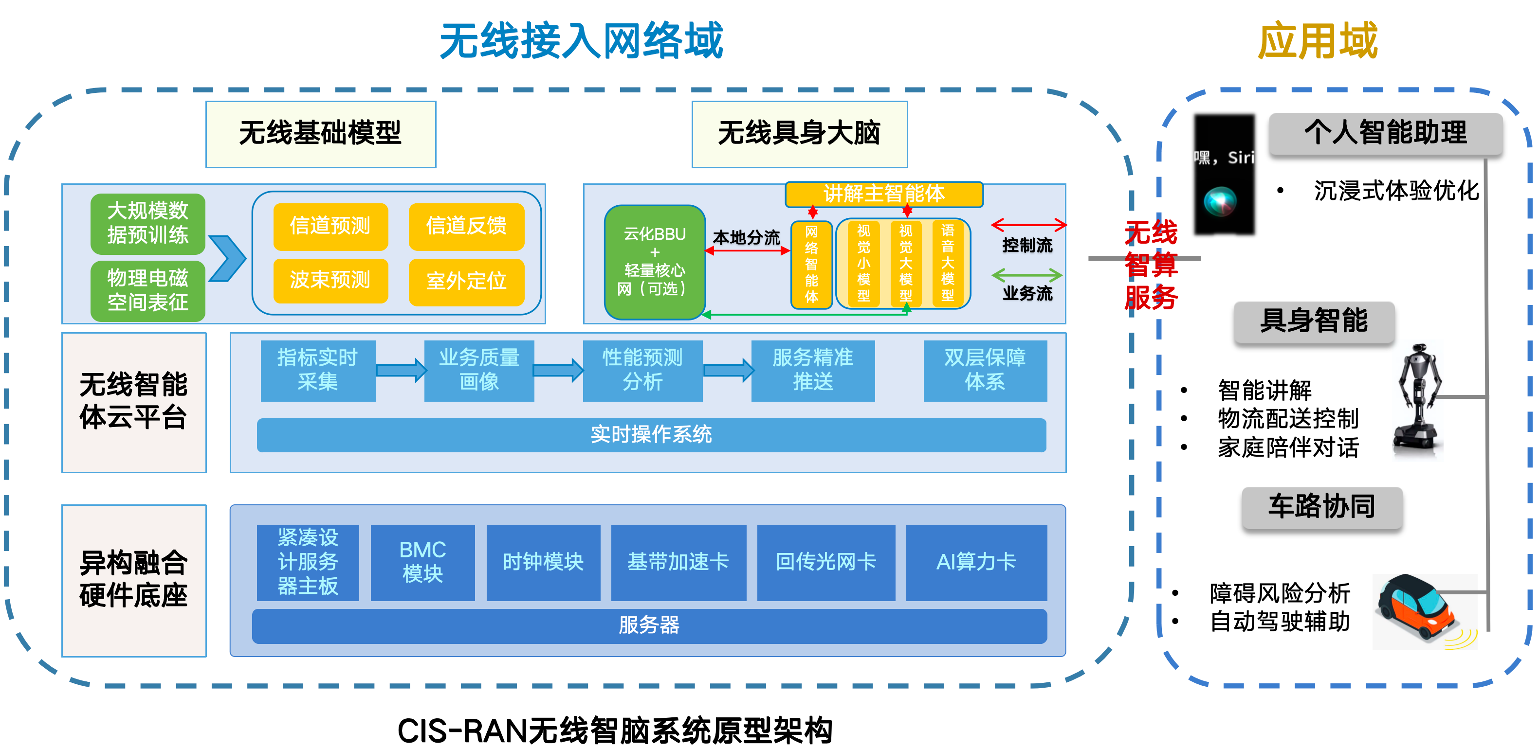 CIS-RAN⽆线智脑系统原型包含四⼤核⼼组成部分:异构融合硬件底座、⽆线智能体云平台、⾯向⽆线接⼊⽹的多模态基础模型,以及赋能AI感知的⽆线具⾝⼤脑。这⼀完整的系统架构旨在解决传统⽆线⽹络与⼈⼯智能系统相互独⽴、难以⾼效协同的根本性问题,为6G⽹络新架构探索和新技术验证提供了系统性平台,将显著加速智能新业务的孵化和产业化进程。