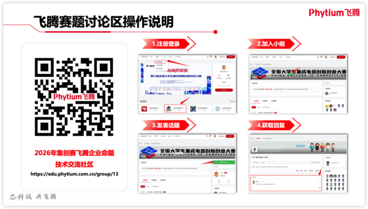 · 技术答疑:为给参赛选手提供一个开放包容的技术交流环境,飞腾公司构建了全方位的技术交流网络,包括社区论坛、微信群、线上直播和专题录播课程等多种形式。社区论坛目前已开放一批赛事精华资料,欢迎扫码加入,通过交流与探讨找出更好的技术解决方案。