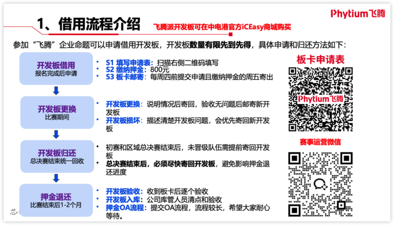 飞腾公司提供一定数量的开发板免费借用,完成报名后即可扫码填写板卡申请表,申请借用飞腾派等开发板,具体事项可添加赛事运营人员微信进行咨询。