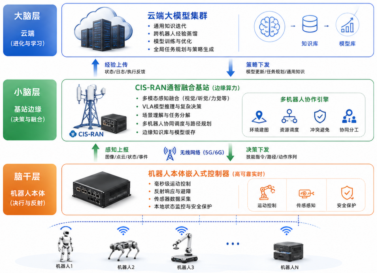 方案系统性地重构了具身智能的技术路径,通过“脑干-小脑-大脑”的层次化分布,实现了性能与成本的最佳平衡。其中,以机器人本体嵌入式控制器为“脑干层”,聚焦极高稳定性与安全性,承担毫秒级实时运动控制与反射响应,是机器人赖以生存的底层中枢;以CIS-RAN基站侧边缘算力为“小脑层”,作为架构的核心创新,将原属于本体且对实时性要求极高的VLA(视觉-语言-动作)模型上移,利用基站强大的边缘算力提供高实时智能服务,负责多模态感知融合与复杂决策,成为多机共享的“逻辑中枢”;以云端大模型集群为“大脑层”,负责通用知识迭代与跨机经验蒸馏,最终形成了“本地执行—边缘决策—云端进化”的完整闭环。