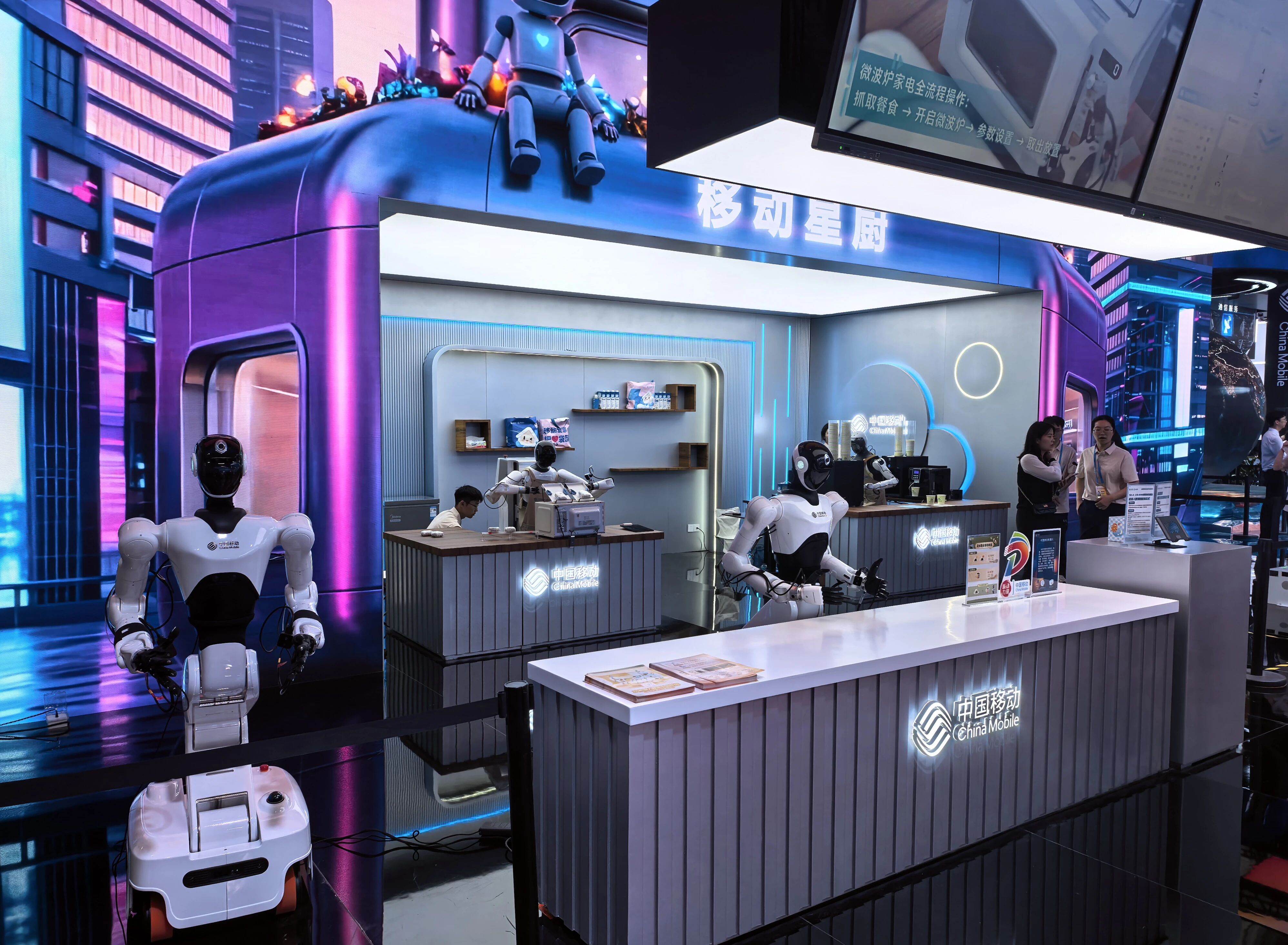 在“移动星厨”科技驿站现场,咖啡机器人的精准抓取、餐食加热机器人的高效作业与跑堂机器人的往来穿梭,共同勾勒出前沿科技与日常生活交融的生动图景。与以往展会上常见的“单体表演”或“预设脚本”式机器人相比,此次展示实现了代际跨越:从单机到群体,它打破了过去孤立作业的局限,实现了基于统一智脑支撑下的全业务链高度协同;从重端到轻端,机器人通过自研5G-A CIS-RAN基站赋予的“边端外挂”成功告别昂贵的本地算力,向着更灵巧、更低成本的方向演进;从执行到感知,依托通算智协同能力,机器人能够实时感知环境动态,实现了复杂场景下的多机避障与任务最优调度。
