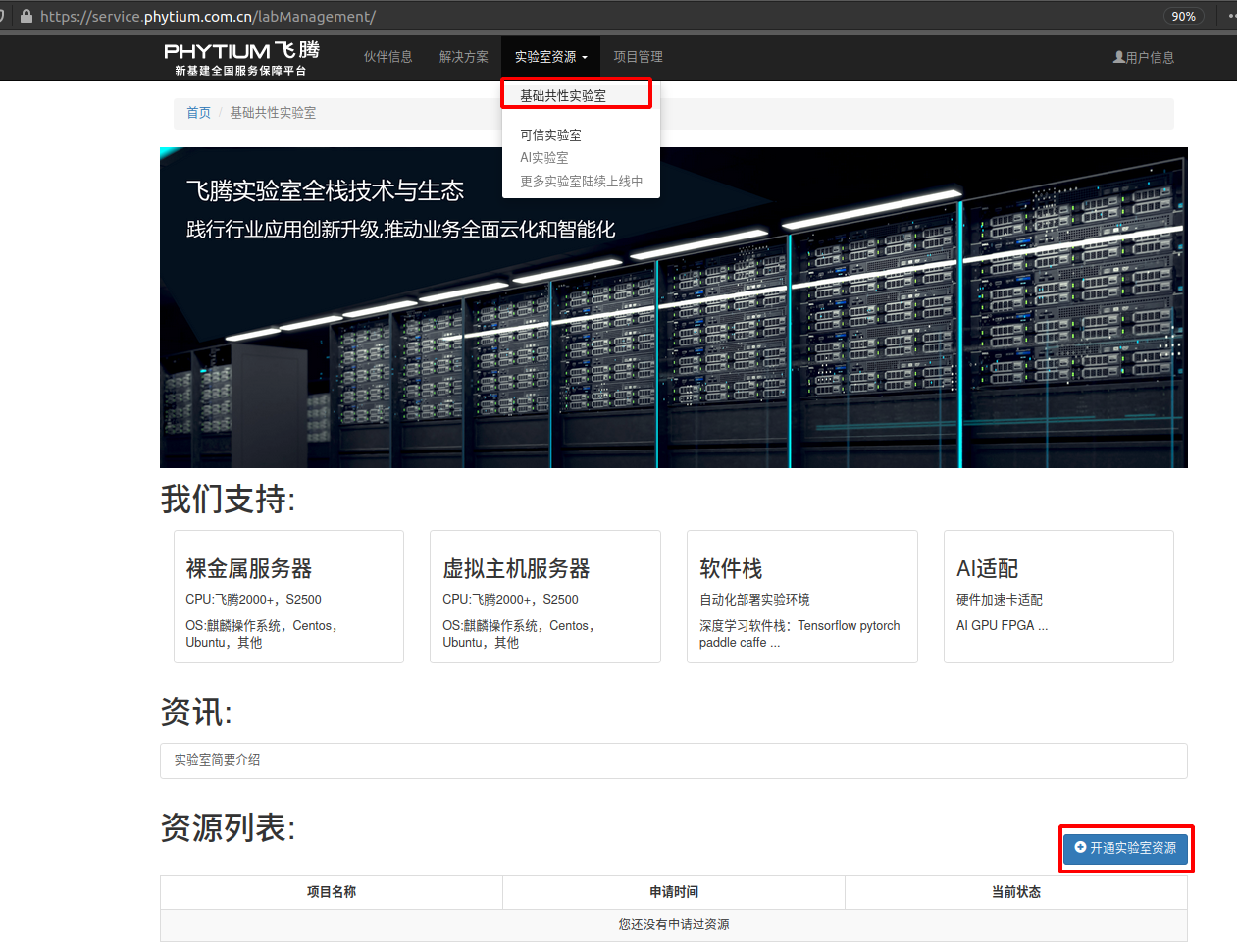 客户登录完成后,点击“基础共性实验室”,将会弹出实验室门户,点击“开通实验室资源”