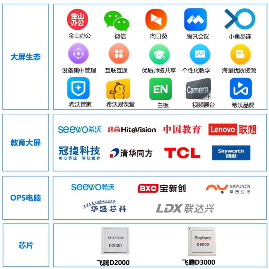 在推进智慧教育领域的合作进程中,基于飞腾腾锐高性能桌面芯片,飞腾携手希沃、鸿合及中国教育等顶尖教育大屏制造商,打造了智慧教育大屏场景解决方案,不仅代表了信创+教育的最新成果。该方案通过以下几个关键维度的创新,全面赋能教育生态,引领未来教育的新风尚: