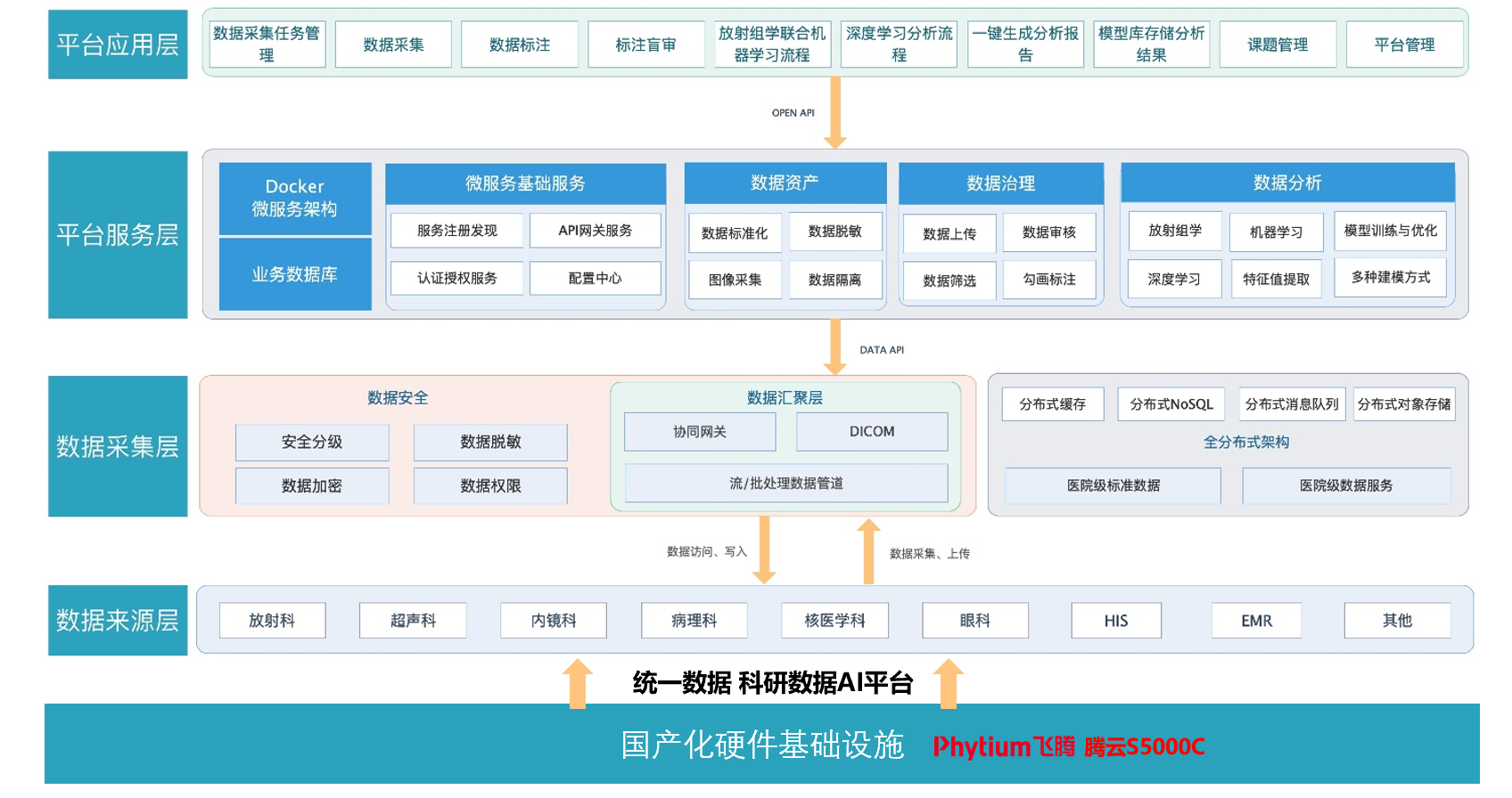 面对上述的诸多问题和挑战,飞腾携手慧影医疗科技(北京)股份有限公司,全力打造基于国产化飞腾处理器的大数据人工智能科研平台联合解决方案,从底层硬件架构到上层应用服务,全方位、系统性地提供国产化医学 AI 科研平台。