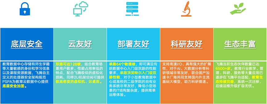 “飞腾腾云”是飞腾系列CPU中面向高性能服务器产品领域的全新子品牌,为服务器和数据中心应用提供强算力、高并发的计算能力。针对教育行业业务特点,具有独特优势。