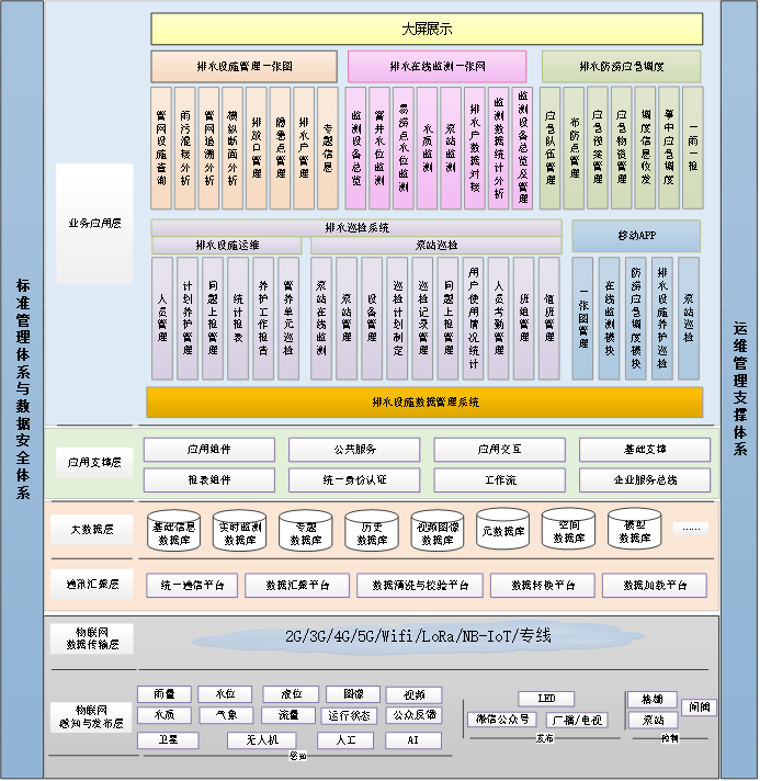 排水智能化软件系统的总体框架在标准规范体系的基础上构建感知接入层、数据层、业务支撑层及业务应用层,而信息安全体系及运行服务体系贯穿于各层之中。总体框架图如图1: