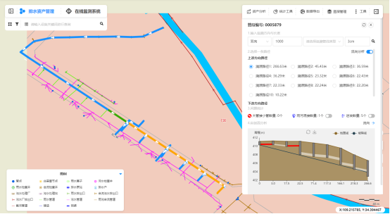 基于地理信息系统(GIS),在城区地图上叠加展示排水管网单位权属管养的各类排水设施,包括排水管网、河涌、户、泵站、水闸等,形成排水设施资产管理一张图,为管理人员者提供一个资产设备管理的驾驶舱,方便管理人员把握整体的资产设施状况,为后续各项应用提供数据基础。主要模块为:地图基本操作、管网追溯分析与混接分析、横断面与纵断面分析、排放口管理、运营看板、隐患点管理、排水户管理、专题报告。