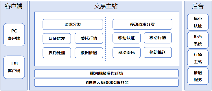 飞腾携手同花顺智能科技,基于飞腾腾云S5000C服务器打造了 同花顺网上交易主站信创版方案。该方案面向国内券商网上交易主站系统国产化改造的需求,实现从服务器设备硬件、操作系统、业务软件的全栈国产化,为客户提供行业领先的业务支撑能力。方案整体架构如下: