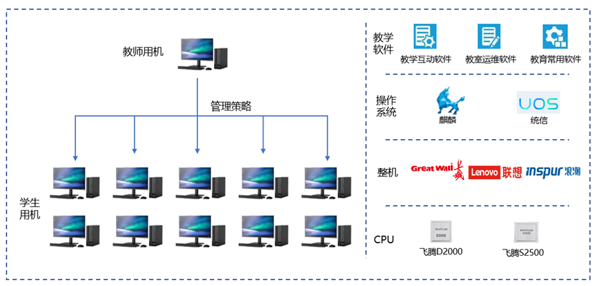 西安潜龙辉腾科技有限责任公司作为一家专业的教育软件产品提供商,携手飞腾信息技术有限公司一起,基于信息科技教室国产软件使用的需求,不同学校对公共信息科技教室和各学科专业教室的需求,推出了信息科技教室管理系统的联合解决方案。方案包括硬盘保护系统、网络同传、网络控制以及资产监控等多种功能,重点解决各类局域网与机房环境内管理员快速方便地向所有计算机部署操作系统、驱动程序及相关应用软件,实施快速清除单机硬盘数据或系统故障,同时可在局域网内对计算机进行统一的快速管理、设置并获得局域网内计算机所有软硬件信息,从而进行机房内的整体资产监控。同时,课堂管理解决方案,从教学、管理、运维等多维度提供数据保护、智能克隆、网络管控、教学管理为一体的运行管理整体解决方案。真正解决从传统Win+x86体系向全国产平台过渡时产生的各种使用和维护难题,让国产从能用到会用,会用到好用实现快速转变。让每一个用户能够切实感受到国产平台带来的便捷和高效。